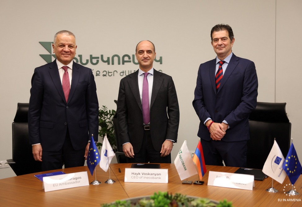 ЕРЕВАН, 26 ноября. /АРКА/. Между Инекобанком, Евросоюзом и Европейским инвестиционным банком 25 ноября в Ереване подписано соглашение о портфельных гарантиях на сумму 30 млн. евро. Оно нацелено на укрепление финансовой доступности для микро-, малых и средних предприятий (ММСП), сообщили в делегации ЕС в РА.