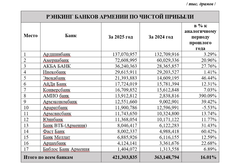 Согласно рэнкингу агентства «АРКА», в пятерку лидеров по показателю прибыли за 2025 год вошли: Ардшинбанк, Америабанк, АКБА Банк, Инекобанк и Эвокабанк.