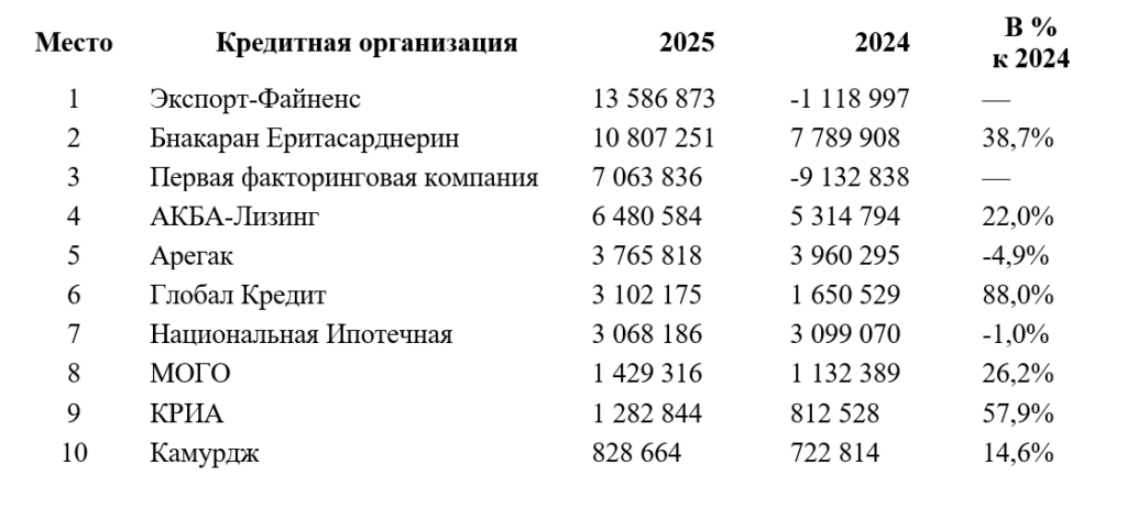 Согласно рэнкингу агентства «АРКА», в пятерку лидеров по показателю чистой прибыли (после налогообложения) за 2025 год вошли Экспорт-Файненс, Бнакаран Еритасарднерин, Первая факторинговая компания, АКБА-Лизинг и Арегак.