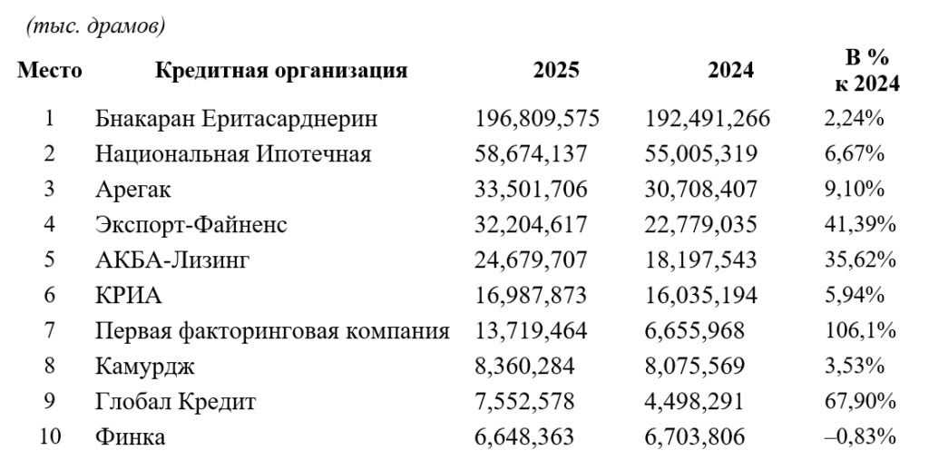 Топ-3 крупнейшие кредитные организации по показателю общего капитала на конец 2025 года: «Бнакаран Еритасарднерин» — 196,8 млрд. драмов, «Национальная Ипотечная» — 58,7 млрд. драмов, «АКБА-Лизинг» — 33,5 млрд. драмов. На эти организации приходится около 63,7% капитала системы.