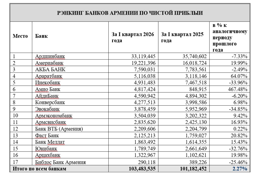Согласно рэнкингу агентства «АРКА», в пятерку лидеров по показателю чистой прибыли (после налогообложения) по итогам I квартала 2026 года вошли Ардшинбанк, Америабанк, АКБА БАНК, Араратбанк и Инекобанк.