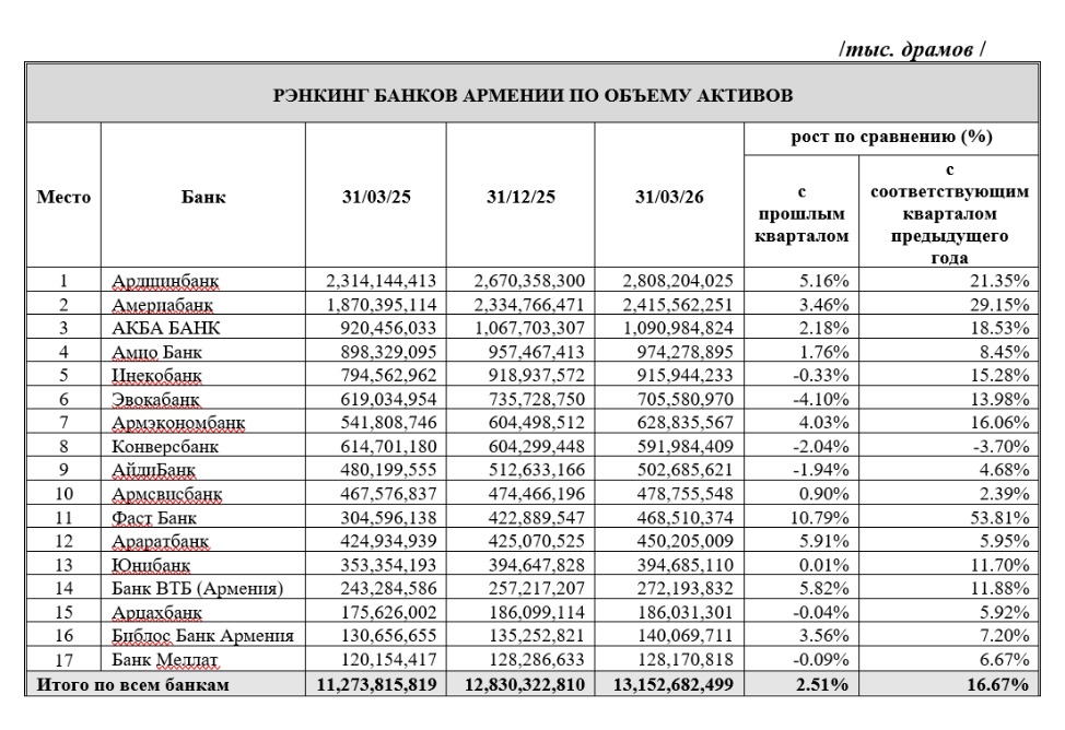 Совокупные активы банков Армении на конец первого квартала 2026 года составили 13,15 трлн драмов против 11,27 трлн драмов на конец первого квартала 2025 года (рост на 16,67%) и против 12,83 трлн драмов на конец четвертого квартала 2025 года (рост на 2,51%).